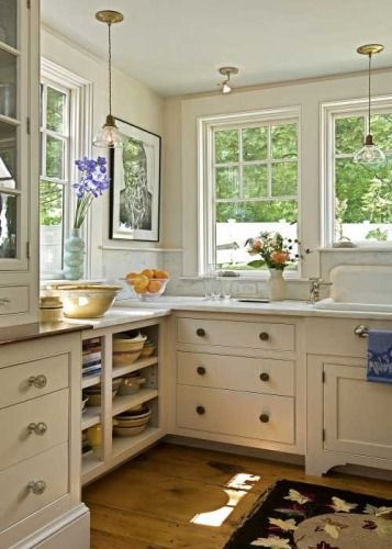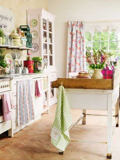 Another dream kitchen with lots of fabric embellishment along with pretty things strewn around the kitchen counter tops and island.