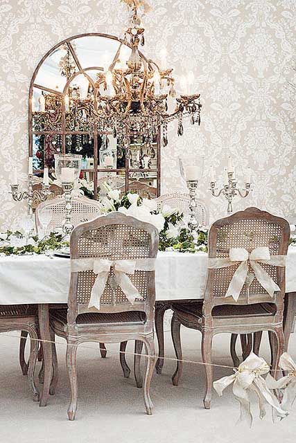 Love the lace garment with ribbon/fabric flowers decked across a French wicker chair.